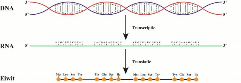 DNA wordt via (m)RNA buiten de celkern vervoerd om dit vervolgens naar een eiwit te kunnen transcriberen